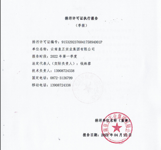 2022年云南皇正實業集團有限公司排污許可證季報 - 第一季度 2022年云南皇正實業集團有限公司排污許可證季報-第一季度