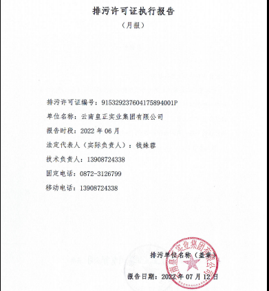 2022年云南皇正實業集團有限公司排污許可證季報 - 第二季度 排污許可證季報-第二季度